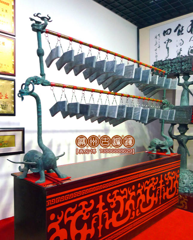 隨州市古編鐘文化發(fā)展有限公司通過考證歷史資料進行研究分析,并八方尋找石源,終于將這套2400多年前的戰(zhàn)國初期大型編磬復(fù)制出來,其發(fā)音與原編磬的標音銘文相符,低音渾厚洪高,高音明澈,音色優(yōu)美而動聽,音域達三個八度,可以旋宮轉(zhuǎn)調(diào),演奏多種樂曲。