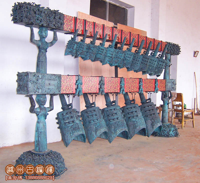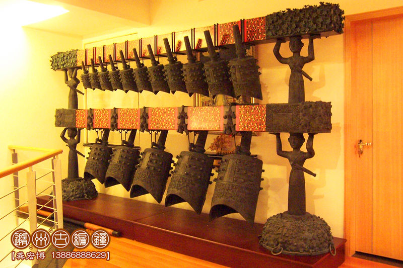 特制16件曾侯乙青銅編鐘,是隨州古編鐘公司應(yīng)美國(guó)客戶的要求,按曾侯乙編鐘設(shè)計(jì)制作的一套特制編鐘,編鐘為青銅鑄造,采用國(guó)際標(biāo)準(zhǔn)樂(lè)音音高A=440Hz調(diào)音,可以演奏古今中外樂(lè)曲,編鐘大梁采用優(yōu)質(zhì)松木制作,表面噴漆,彩繪花紋。編鐘制作完成后,由公司專人專車配送到美國(guó)客戶位于中國(guó)珠海的公司陳列。這位美國(guó)客戶非常喜歡中國(guó)文化,曾多次到公司進(jìn)行考察了解,最終在公司定購(gòu)一套特制16件曾侯乙青銅編鐘。