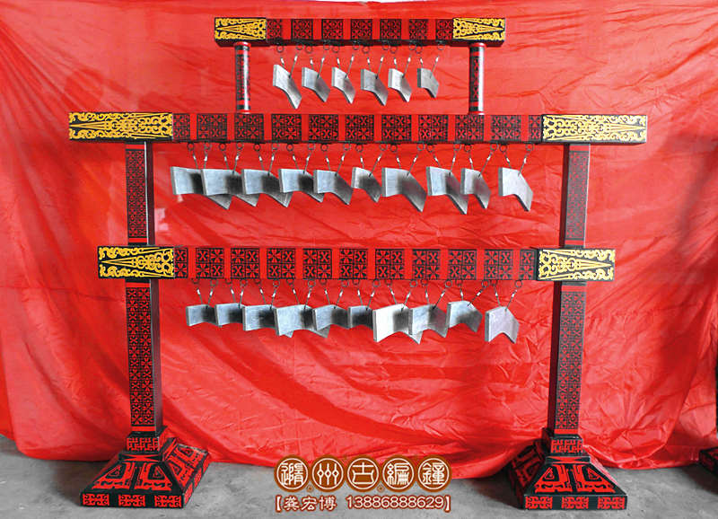 16件套系編磬規(guī)格:長(zhǎng)2米×寬0.4米×高1.8米,懸掛22塊磬片,共三層,上空,中11塊,下11塊,編鐘編磬的大梁和底桌采用優(yōu)質(zhì)杉木加工制作,表面彩繪仿古花紋。