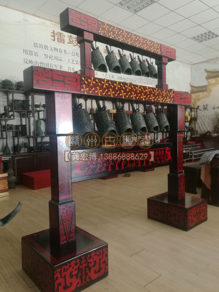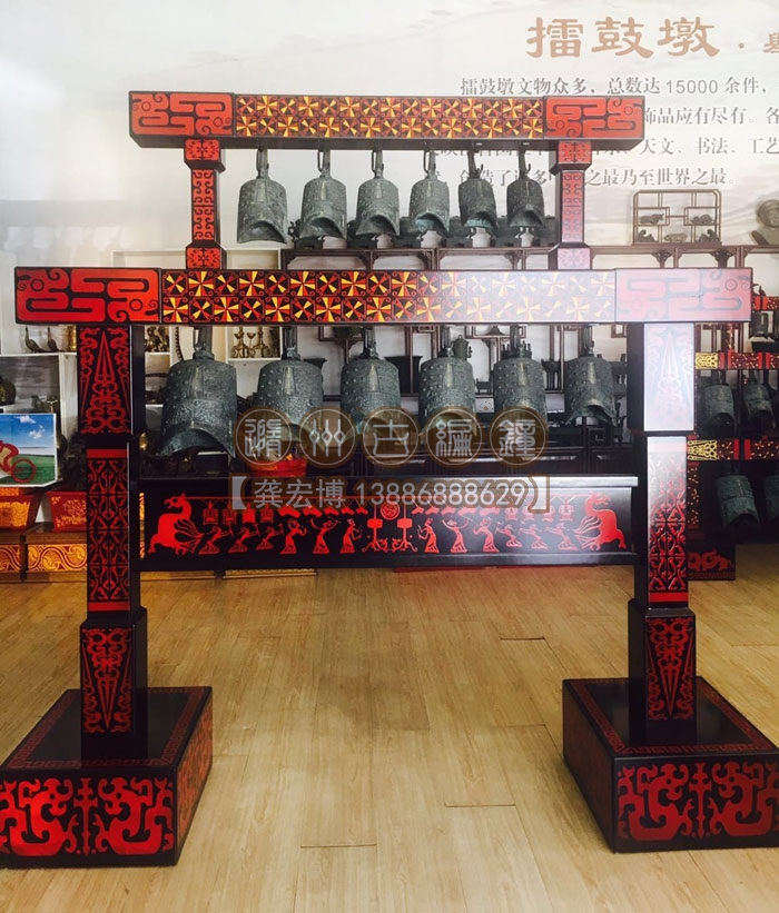12件演奏型編鐘支架采用漆木工藝制作,古樸典雅,鐘音優(yōu)美準確。