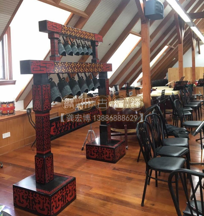 上海客戶定制的12件編鐘長2米、高2米、寬0.55米,分兩層懸掛了12件青銅編鐘,每件編鐘均可發(fā)出2個不同的樂音,半音齊備,采用A=440Hz標準調(diào)音,適合小型民樂團體使用,豐富了民樂團的整體音樂效果,從而獲得客戶的一致好評。