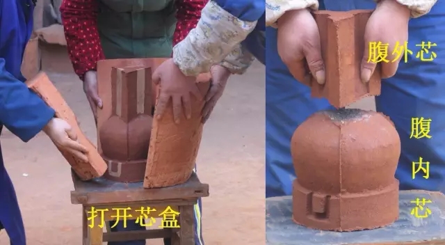 這種鼎的芯分腹內(nèi)芯和腹外芯兩個(gè),所以要用一個(gè)芯盒制作出兩個(gè)芯,也就是一盒兩芯。
