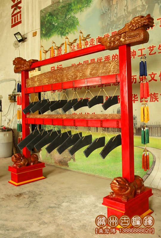 此套編鐘、編磬是根據(jù)清乾隆五十五年(1790年)【清金編鐘】、【清康熙五十四年石磬】而仿制的,因為客戶時間有限而未能做的完美。