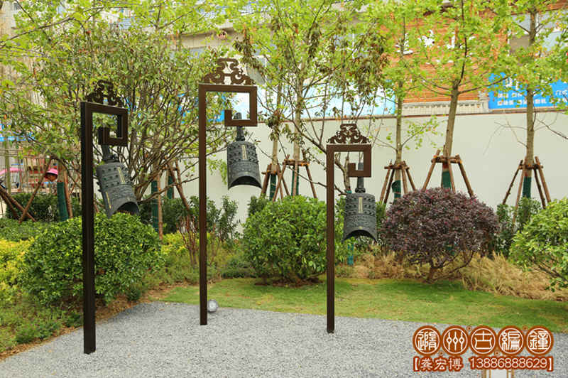 青銅古鎮(zhèn)文化雕塑——鐘柱,一組共3件,高低錯(cuò)落排列,懸掛3件編鐘均可發(fā)音。