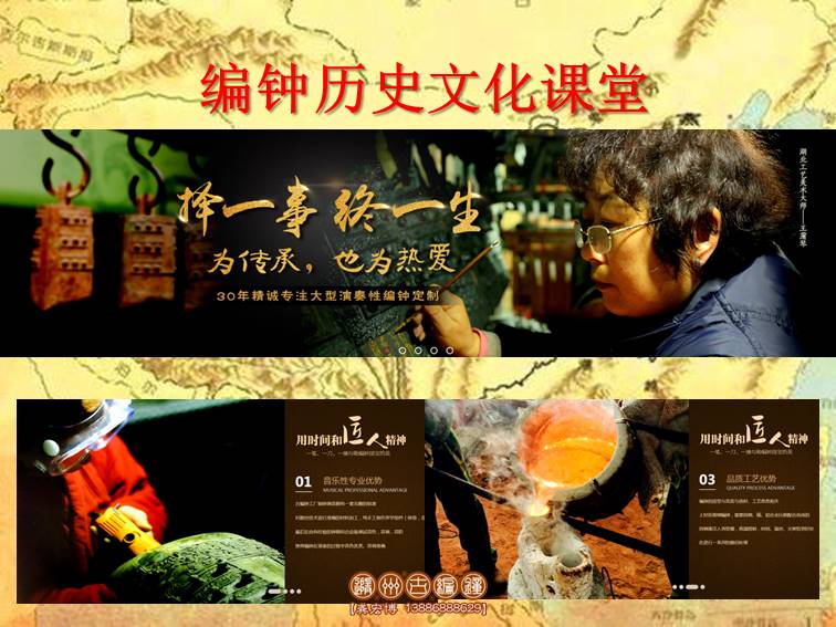 序:同學(xué)們,大家好!我是編鐘文化傳承人龔宏博,從我的父輩起就開始從事編鐘的復(fù)仿制工作,如今已有快30年了,感謝謝老師給了我這次機(jī)會(huì),很榮幸今天被邀請(qǐng)來到    學(xué)校,和大家一起分享關(guān)于編鐘的歷史文化。